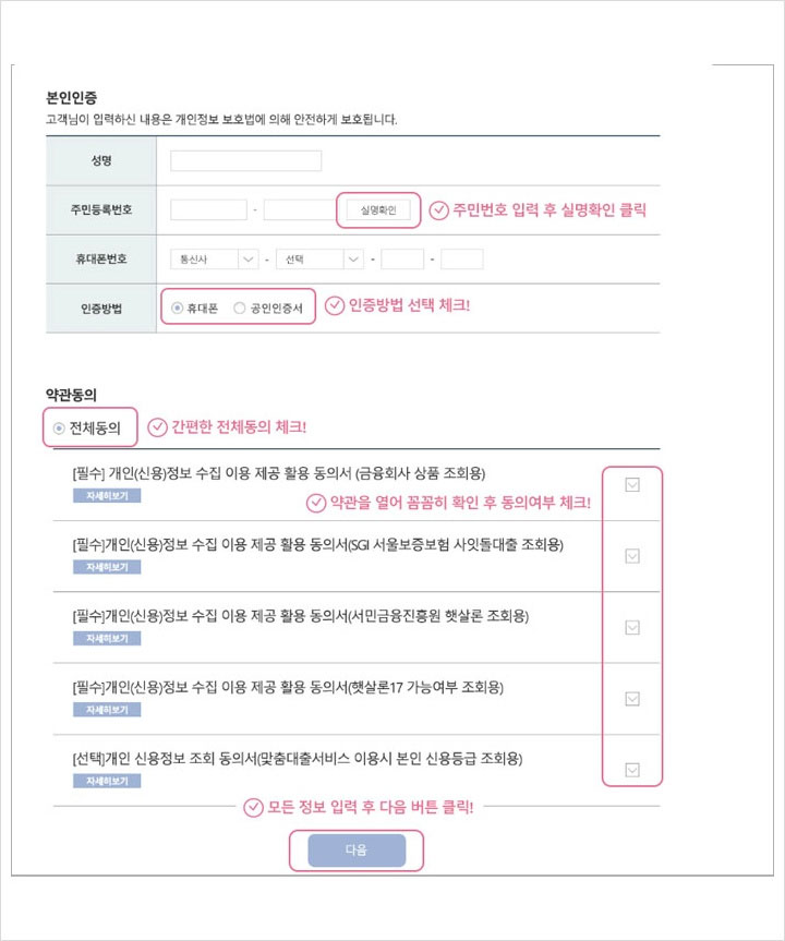 개인정보보호를 위한 동의사항과 본인인증 절차가 진행되는데요. 주민등록번호를 입력 후 실명확인을 클릭해 주시구요.이 후 인증방법 선택을 체크해 인증을 해 주면 된다고 해요. 약관을 열어 꼼꼼히 확인 후 약관동의 여부를 체크해 주세요. 필수와 선택이 있기 때문에 잘 확인하셔야 하구요. 모든 정보를 입력 후 다음 버튼을 클릭해 주세요.