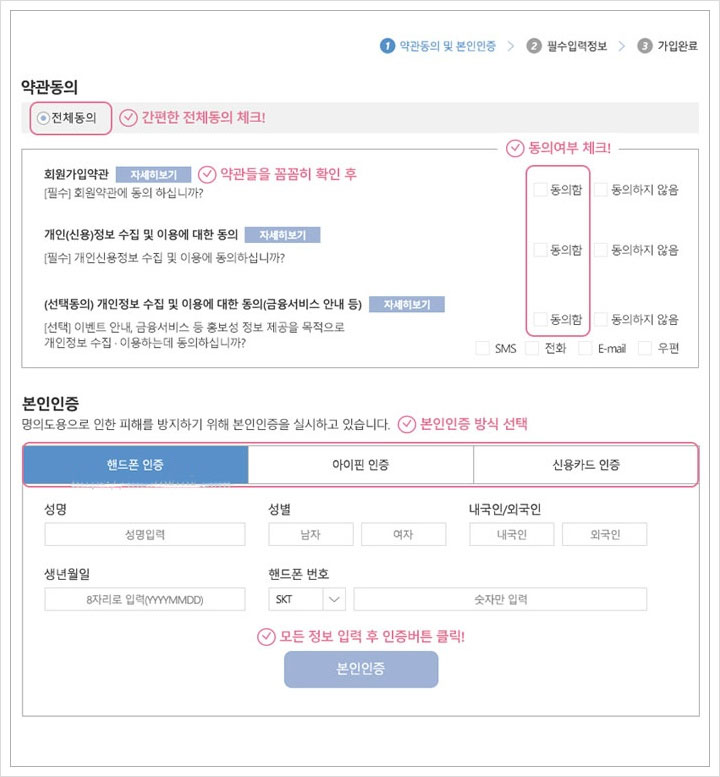 다음으로는 약관동의 및 본인인증이 필요한데요. 회원약관과 개인정보보호를 위한 동의사항을 체크하고 본인인증이 필요한 단계라고 해요. 약관들을 꼼꼼하게 확인 후 동의 여부를 체크해도 되구요. 간편한 전체동의를 선책해도 된다고 해요. 필수와 선택이 있기 때문에 잘 확인 후 체크해주셔야 해요.