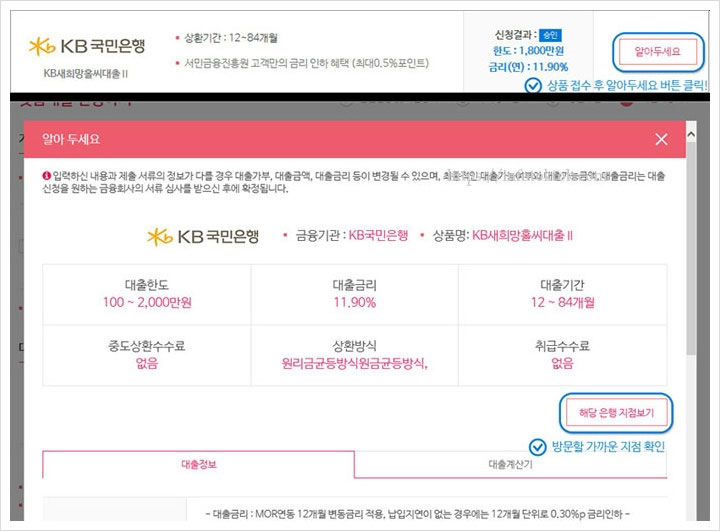 결과 확인 및 알아두세요를 확인하시면 되는데요. 상품접수 후 알아두세요 버튼을 클릭하게 되면 금융기관 및 대출한도, 대출금리, 대출기간, 중도상환 수수료, 상환방식, 취급수수료 등을 확인할 수 있구요. 방문할 가까운 지점은 해당지점보기를 통해 확인할 수 있다고 해요.