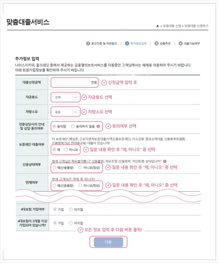이 후 대출심사에 필요한 추가정보입력를 정확하게 입력하면 되는데요. 신청금액 입력 후 자금용도 선택, 차량소유 선택