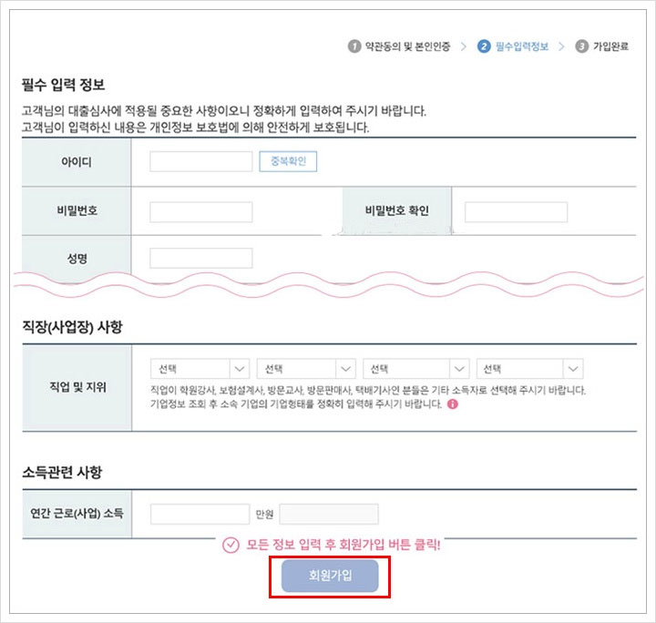본인인증 방식을 선택하고 모든 정보를 입력후 인증버튼을 클릭하게 되면 이 후 회원가입에 필요한 정보를 입력하는 단계가 진행되는데요. 모든정보를 정확하게 입력한 후 회원가입 버튼을 클릭해 주면 서민금융진흥원 맞춤대출 회원가입이 완료된다고 해요.