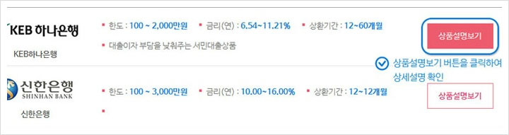 이 후 상품추전 단계가 진행되는데요. 원하는 금융기관 및 상품정보를 상품설명보기를 통해 확인해 주세요.