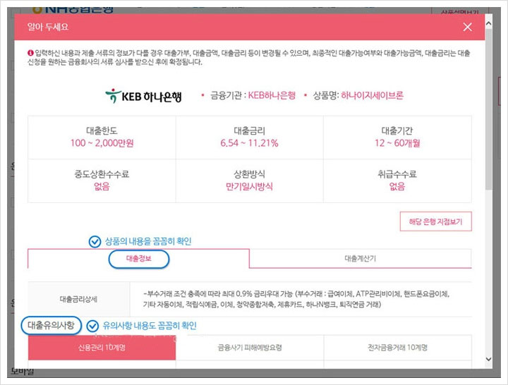 선택한 상품정보 및 유의사항을 꼼꼼하게 확인하시구요. 원하는 대출상품의 가능여부를 조회해 주면 되는데요. 상품체크 후 화면 상 하단에 위치한 선택대출 버튼을 클릭하시거나 화면 우측에 따라다니는 배너에서 선택대출 확인 후 조회버튼을 클릭해주세요.