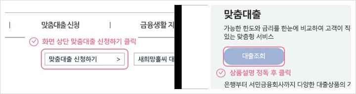 이후 메인으로 버튼을 클릭해 주면 맞춤대출 신청과정이 진행되는데요. 화면상단에 있는 맞춤대출 신청하기를 클릭해 주시구요. 상품설명을 잘 확인한 후 대출조회를 클릭해 주세요.