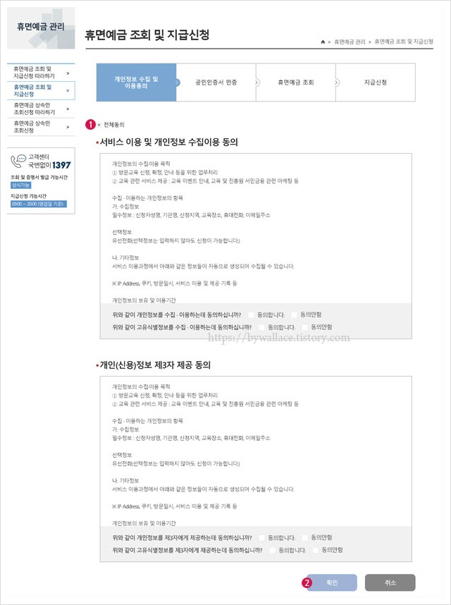 휴면예금 조회 및 예금에 대한 지급신청을 위해서는 개인정보 이용 동의는 필수인데요. 위아래 모든 사항에 대해 이용 동의를 한 후 동의를 클릭해 주세요. 참고로 한 가지라도 빠지면 다음 단계로 진행이 되지 않아요.