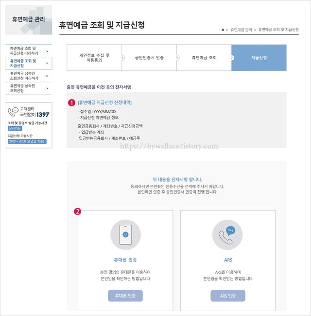 이후 본인계좌 지급이나 기부 신청내역에 대한 전자서명절차가 진행되는데요. 전자서명에 동의하게 되면 본인 확인 인증이 한 번 더 이루어진 후 공인인증서 인증이 진행되구요. 모든 이용 절차가 끝나면 휴면예금 지급신청 내역 조회 및 증명서 발급이 가능하답니다.