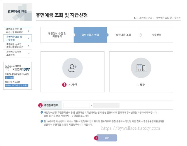 개인정보 수집 및 이용동의가 끝나면 공인 인증서 인증 페이지가 나오는데요. 개인과 법인 중 개인을 선택한 후 주민등록번호나 사업자등록번호를 입력한 후 확인 버튼을 클릭해 공인인증서 인증을 진행해 주세요.