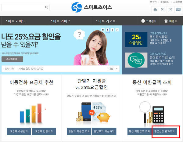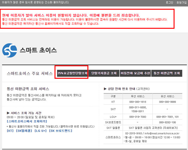 하지만 현재 휴대폰 요금할인 25% 대상 조회 접속 인원으로 인해 스마트초이스 홈페이지 서비스가 원활하지 않은 상태인데요. 따라서 스마트초이스 통신 미환급액 조회하기 방법은 해지한 통신사 홈페이지에서도 직접 조회하실 수 있다고 해요.