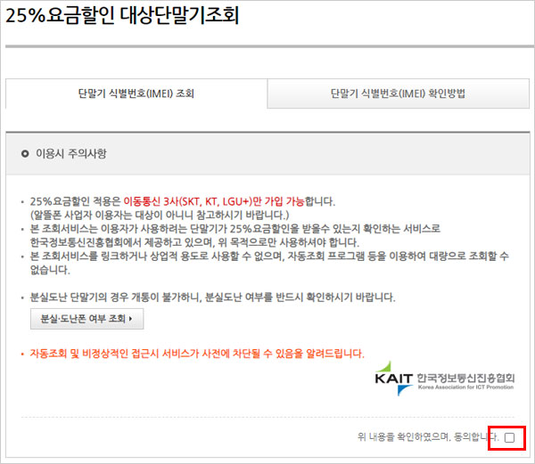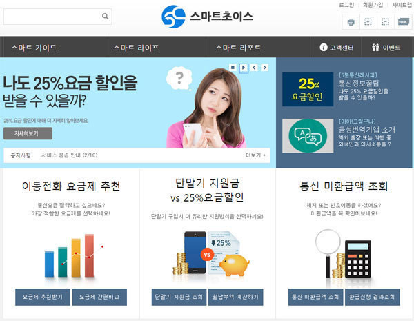 ‘스마트초이스’에 접속하시면 본인의 핸드폰 번호와 단말기의 고유번호를 입력하면, 이 단말기가 보조금을 받았는지 보조금을 받았다면 약정이 지났는지 안 지났는지를 조회해줌으로써 25% 요금할인대상인지 알려준다고 합니다.