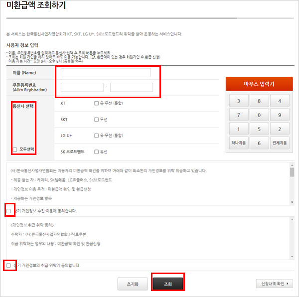 사용자 정보를 입력란이 나옵니다. 여기서 이름, 주민등록번호와 통신사를 선택하면 회원가입 없이 조회가 가능하다고 해요. 단 구 KTF, KT-PCS 가입자는 KT 이동전화를 선택하여 조회하시면 되구요. SKT, KT, LGU+ 통신사를 선택하여 조회할 경우, 각 통신사 망을 이용하는 알뜰폰 사업자에 대한 미환급액 조회도 동시에 진행된다고 해요.