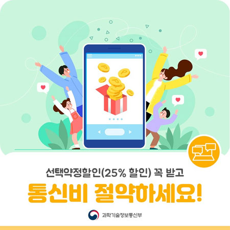 매달 휴대폰 요금 25%를 할인받을 수 있는 '선택약정할인' 가입 대상이지만 이를 이용하지 않는 소비자가 1200만명에 달한다고 해요. 이에 매월 통신 요금의 25%를 절약할 수 있는 '선택약정 할인' 제도에 대한 홍보가 강화된다고 합니다.