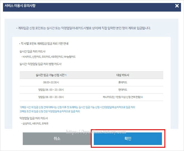 계좌입금 신청은 1포인트부터 가능한데요. 계좌이체를 신청할 경우 원칙적으로 즉각 처리된다고 해요. 하지만 오후 8시 이후 신청한 경우에는 다음 영업일에 처리될 수 있다고 합니다. 다만 법인회원은 이체 내역 조회는 가능하지만 변경과 해지는 불가능 하다고 해요.