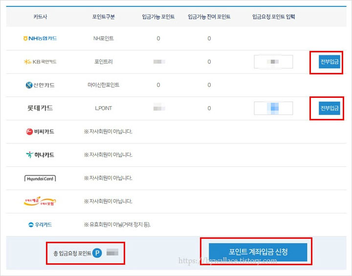 각카드사에 있는 입금 가능한 카드 포인트가 보여지는데요. 입금가능 포인트가 조회 된 카드사 오른쪽 전부입금 항목을 클릭하게되면 아래 총입금요청 포인트 항목에서 자동으로 포인트가 합산되죠. 하단 포인트 계좌입금 신청 항목을 클릭 해주시구요. 여신금융협회 카드포인트 통합조회 계좌입금 이용시 유의사항은 확인하셨다면 아래 확인을 클릭해 주세요.