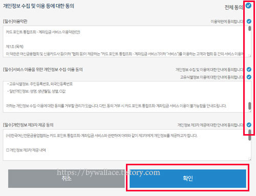 카드포인트 통합조회 서비스 이용을 위해서는 개인정보 수집 및 이용 등에 대한 동의가 필요한데요. 필수 항목 모두 동의한 후 아래 확인을 클릭해 주세요.