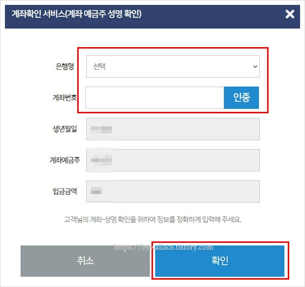카드포인트 통합조회서비스 이용 방법 중 입금받을 계좌확인 서비스 단계입니다. 계좌 및 예금주 성명을 확인합니다. 인증 후 확인을 클릭하면 여신금융협회 카드포인트 통합조회 계좌입금 신청이 완료됩니다.