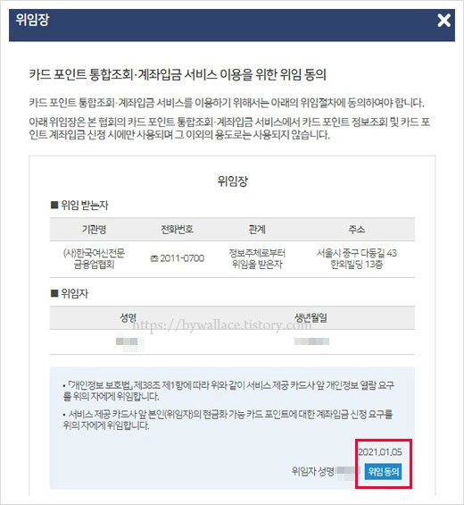 이용중인 통신사를 선택 해 인증을 진행하면 됩니다. 카드 포인트 통합조회 및 계좌입금 서비스 이용을 위한 위임 동의 항목이 보여집니다. 이용을 위해서는 동의가 필요합니다. 확인 후 아래 위임동의를 클릭해 줍니다.