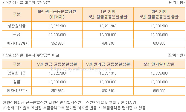 ※ 5년 원리금 균등분할상환 및 5년 만기일시상환은 상환방식별 비교를 위한 예시입니다.