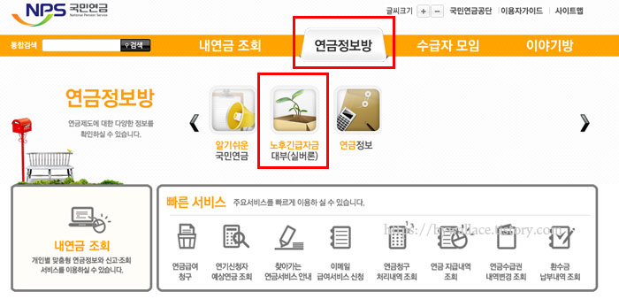 새창이 열리면서 내연금 조회 등을 비롯한 국민연금에 대한 여러 정보들을 확인 할 수 있습니다. 여러 항목 중 연금정보방 항목을 클릭하면 노후긴급자금 대부인 국민연금 실버론을 확인할 수 있습니다.