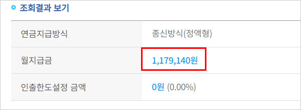 월지급금은 부부 중 나이가 적은 분을 기준으로 산정된다고 합니다. 또한 앞에서 언급했듯이 계산결과에서 보여지는 연금금액과 실제 월지급금 및 인출한도 금액은 가입시점 등에 따라 달라질 수 있다고 합니다. 이점은 참고해야 합니다.