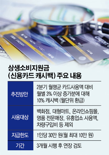 2분기 월평균 카드 사용액 대비 3% 초과한 사용액의 10%를 현금으로 돌려주는 신용카드 캐시백은 전국민 대상입니다. 월 10만원, 최대 30만원이란 한도가 설정돼 있으나 기본적으로 소비 여력이 있는 고소득층에 유리한 제도입니다.