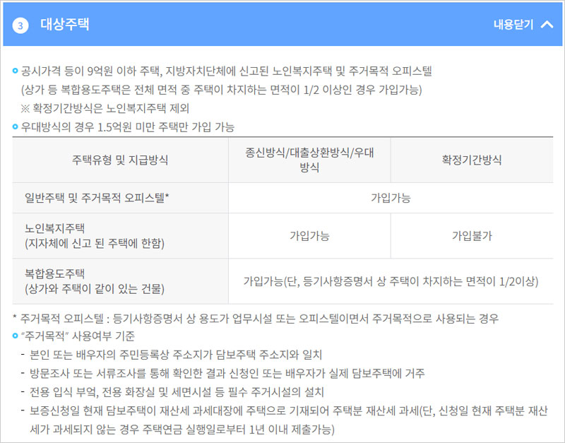 ▶ 공시가격 등이 9억원 이하 주택, 지방자치단체에 신고된 노인복지주택 및 주거목적 오피스텔. (상가 등 복합용도주택은 전체 면적 중 주택이 차지하는 면적이 1/2 이상인 경우 가입가능).