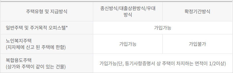 ※ 해당주택을 전세 또는 월세로 주고 있는 경우 가입 불가. (단, 부부 중 한 명이 거주하며 보증금 없이 주택의 일부만을 월세로 주고있는 경우 가입 가능)