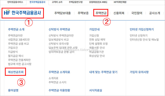 물론 한국주택금융공사 홈페이지를 통해서도 주택연금 예상연금조회가 가능한데요. 홈페이지에서 주택연금을 클릭하면 예상연금조회 항목이 나오는데요. 클릭해서 들어가면 주택연금 예상연금 조회 및 수령금액 계산이 가능하다고 해요.