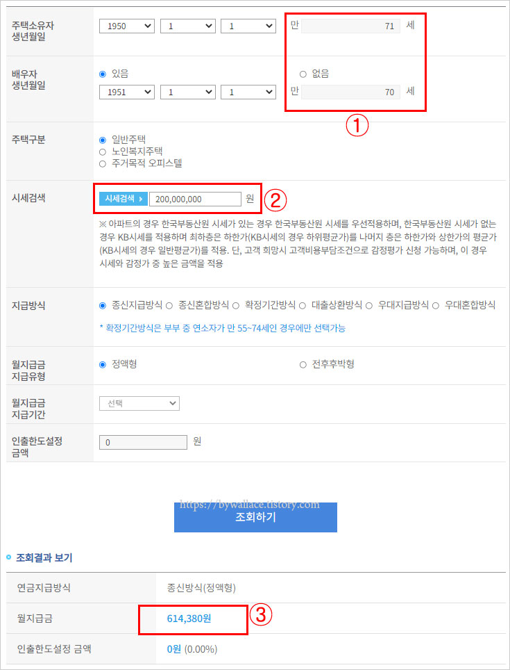 먼저 주택소유자와 배우자 생년월일은 입력해 주세요. 임의로 70세와 배우자는 69세를 입력해 보았구요. 주택구분은 일반주택을 선택한 후 지급방식은 종신지급방식, 월지급금 지급유형은 정액형을 선택했어요. 인출한도설정 금액은 종신지급방식 및 우대지급방식을 제외한 지급방식에서 선택이 가능해요.
