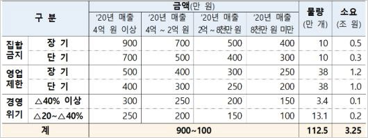 참고로 국회 산자위 소속 더민주 이동주 의원실이 6일 중소벤처기업부로부터 받은 자료에 따르면 집합금지 및 영업제한 조치로 인해 지원금을 받게 될 소상공인 및 자영업자는 약 96만 명이라고 하는데요. 이 중 장기간의 집합금지 조치를 받고 지난해 매출액이 4억원이 넘어 상한인 900만원을 받게 될 사람은 3000명 정도라고 합니다.