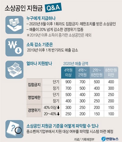 A. 정부의 신종 코로나바이러스 감염증(코로나19) 방역 조치로 영업을 제대로 하지 못한 소상공인 및 소기업이 대상이 됩니다. 지난해 8월 이후 한 번이라도 집합금지·영업제한 조치를 받았거나, 경영위기업종에 해당하며 매출이 줄어든 소상공인이면 지원할 수 있습니다.