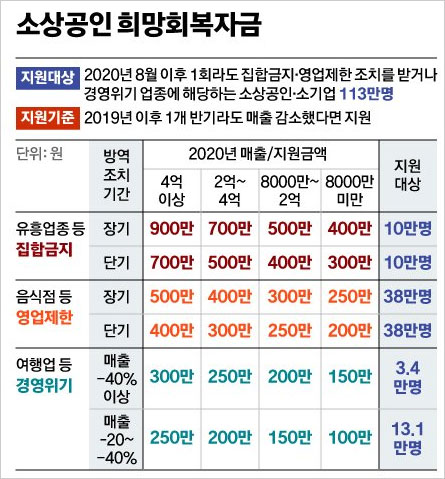 참고로 국회 산자위 소속 더민주 이동주 의원실이 6일 중소벤처기업부로부터 받은 자료에 따르면 집합금지 및 영업제한 조치로 인해 지원금을 받게 될 소상공인 및 자영업자는 약 96만 명이라고 하는데요. 이 중 장기간의 집합금지 조치를 받고 지난해 매출액이 4억원이 넘어 상한인 900만원을 받게 될 사람은 3000명 정도라고 합니다.