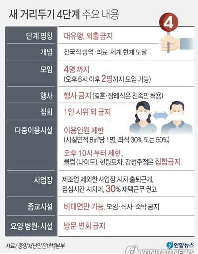 새로 개편된 사회적 거리두기 체계는 4단계로 구성돼 있다고 합니다. 이 중 사회적 거리두기 4단계는 새 거리두기 체계에서 가장 높은 수위의 방역 수칙이 적용되는 것이라고 합니다. 참고하셨으면 좋겠습니다.