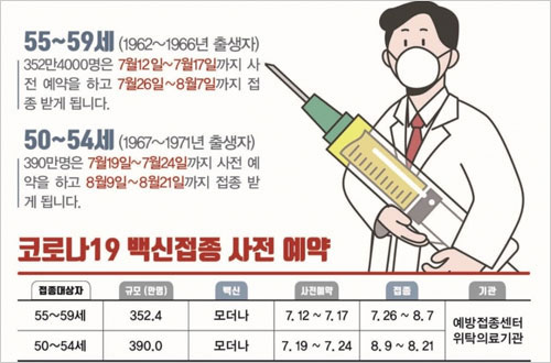 코로나19 예방접종대응추진단에 따르면 55~59세(1962~1966년생)는 7월 12일부터 17일까지 사전 예약을 하고 26일부터 내달 7일까지 전국 예방접종센터와 위탁의료기관에서 모더나 백신을 접종받게 된다고 합니다. 50~54세(1967~1971년생)는 19일부터 24일까지 사전 예약을 하고 8월9일부터 1차 접종을 받게 됩니다.