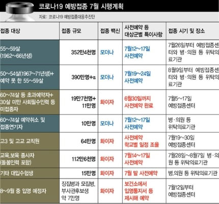 7월 12일부터 50대 백신 접종 예약이 시작됐습니다. 55∼59세(1962년 1월 1일∼1966년 12월 31일 출생자) 352만4000명을 대상으로 한 백신 접종 사전예약이 이날부터 오는 17일까지 6일간 진행된다고 코로나19 예방접종대응추진단이 밝혔습니다.