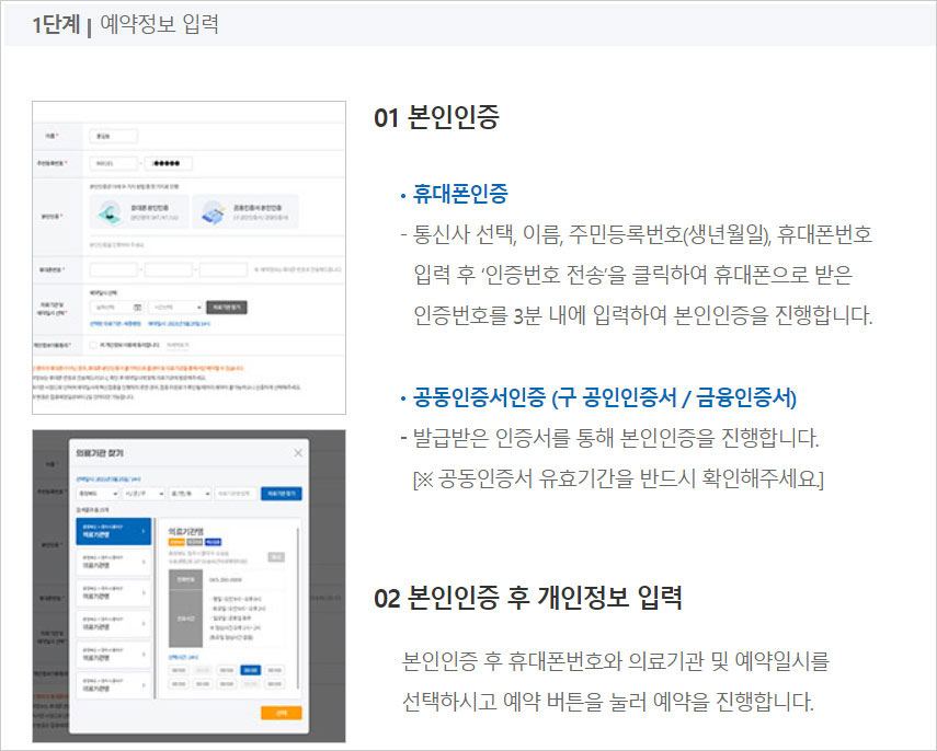 코로나 백신접종 온라인 예약은 웹, 모바일로 모두 가능합니다. 총 2단계의 과정만 거치면 완료됩니다. 이름, 주민등록번호(생년월일), 휴대폰번호 등을 입력 후 인증번호를 받아 '휴대폰인증'을 하거나 공동인증서(구 금융인증서) 인증으로 본인인증을 하면 됩니다.
