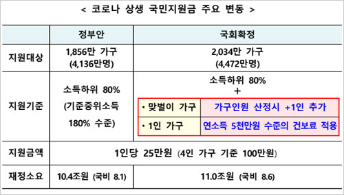 기획재정부가 '가구소득 하위 80%'(기준중위소득 180% 수준)를 완강하게 주장했던 코로나 상생 국민지원금은 지급 대상이 전체 국민의 87.7%로 넓어졌는데요. 이는 맞벌이 가구와 1인 가구 지급 대상이 정부 안보다 늘어난 데 따른 결과라고 합니다.
