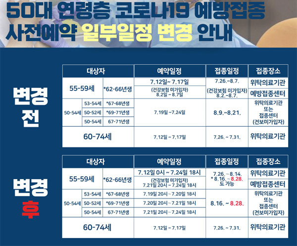 55세 이상 백신 접종 예약 시기 및 백신접종사전예약 방법에 대해 알아보도록 하겠습니다. 55세 이상 백신 접종 예약 시기는 7월 24일 오후 6시까지입니다. 만 55세~59세 및 50세~54세, 60세~74세 미접종자에 대해 백신사전예약이 실시됩니다.