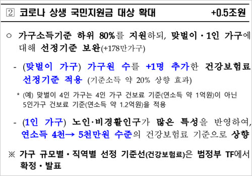 1인 가구의 경우는 국회 추경 심의 과정에서 노인이나 비경제활동인구가 많은 1인 가구 특성이 고려돼 연소득 5천만 원 수준으로 건보료 적용 기준이 상향됐다고 합니다. 따라서 월 416만 원 수준까진 지원금을 받을 수 있습니다.