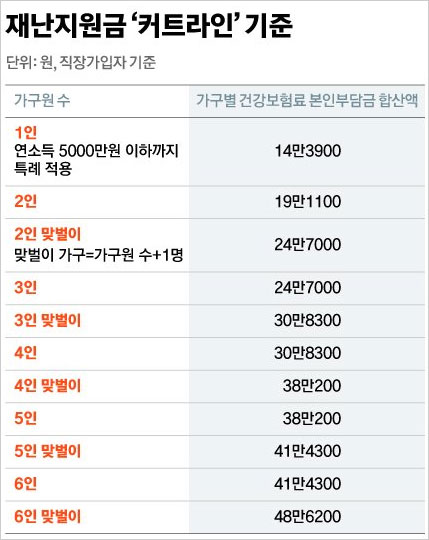 정부안에서 1인 가구는 연 소득 4천만원 수준까지 지원금을 받을 수 있었습니다. 하지만 국회를 통과한 최종 계획에서는 이를 연 5천만원까지 늘렸다고 합니다. 직장가입자 홑벌이 기준으로 2인 가구는 19만1100원, 3인 가구는 24만7천원, 4인 가구는 30만8300원 이하라면 지원금을 받을 수 있습니다.