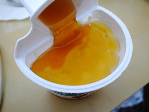 4. 그릭 요거트 등을 먹을 때 한쪽에 꿀이나 잼, 초콜릿 등이 있는데 편리하게 먹는 방법이 있다. 한쪽 부분을 요거트 쪽으로 '접으면' 된다.