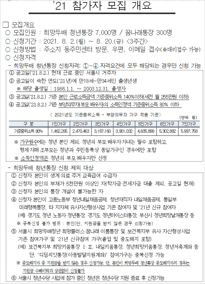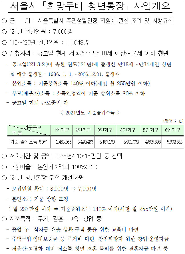 서울시는 올해 추경을 포함해 총 147억 원을 투입해 서울시 희망두배 청년통장 가입자 7000명을 선정하고, 2025년까지 매년 7000명씩 신규 가입자를 모집 및 선정할 계획이라고 합니다.