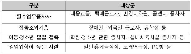 지자체 우선접종 대상은 크게 음식점 및 노래연습장, PC방을 비롯한 감염위험이 높은 시설의 종사자, 장애인 및 외국인 근로자 유학생을 포함한 접종 소외계층, 대중교통·택배근로자·환경미화원을 비롯한 필수업무 종사자, 학원 교사를 포함한 아동·청소년 밀접 접촉자 등으로 각 지자체에서 자율적으로 선정합니다.