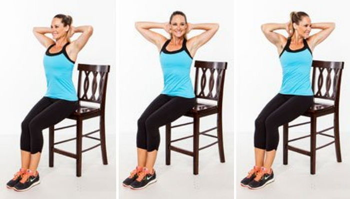 해당 자세는 먼저 의자 가장자리에 앉은 후 무릎을 가지런히 붙이고 손은 머리 뒤로합니다. 다음 허리를 양쪽으로 한 번씩 비틀어주는데 이때 근육이 당긴다는 느낌이 있어야 합니다. 이 뱃살빼는 운동 자세는 20번 정도 반복해주는 것이 좋습니다.