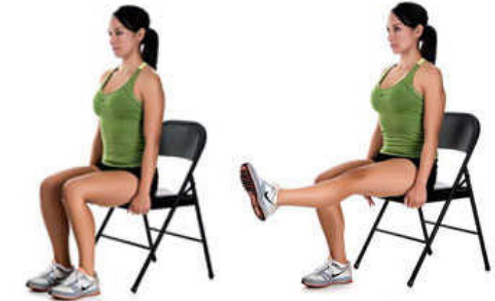 먼저 척추와 어깨가 바르게 되도록 의자에 앉은 후 손바닥을 엉덩이 근처에 두고 무게 중심을 잡습니다. 이후 가슴 쪽으로 두 무릎을 당긴 뒤 5초 동안 자세를 유지합니다. 다시 다리를 천천히 아래로 내린 후 해당 동작을 여러 번 반복합니다.