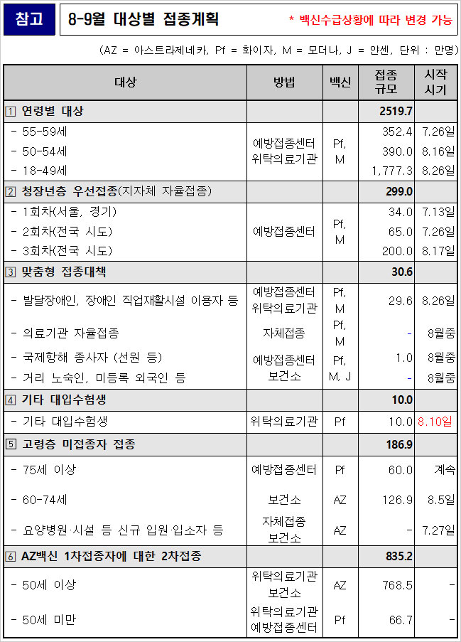 같은 달 8월 22일부터 9월 17일까지는 18∼49세 전체에 대한 추가 예약은 물론 모든 대상자가 추가로 예약하거나 접종 일정을 변경할 수 있다고 합니다.