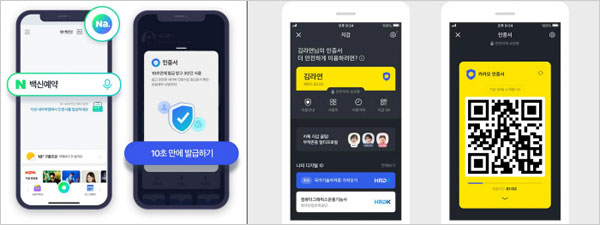네이버 앱에선 첫 화면을 위에서 아래로 당기거나 상단의 'Na.' 메뉴를 누르면 인증서를 발급받을 수 있습니다. 카카오톡에선 앱 화면 하단의 '더보기' 탭에서 발급받을 수 있습니다. 네이버 PC 웹으로도 발급이 가능하다고 합니다.