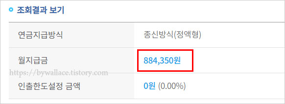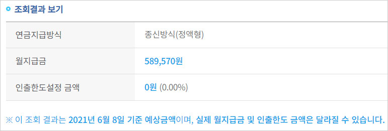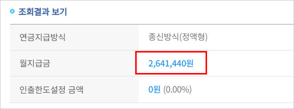 월지급금은 부부 중 나이가 적은 분을 기준으로 산정됩니다. 또한 앞에서 언급했듯이 계산 결과에서 보여지는 연금금액과 실제 월지급금 및 인출한도 금액은 가입시점 등에 따라 달라질 수 있습니다. 이점은 참고하셔야 합니다.