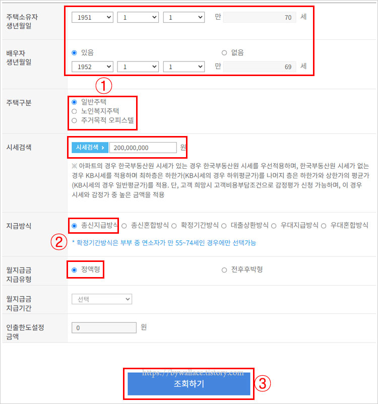 먼저 주택소유자와 배우자 생년월일은 입력합니다. 임의로 70세와 배우자는 69세를 입력해 보았습니다. 주택구분은 일반주택을 선택한 후 지급방식은 종신지급방식, 월지급금 지급유형은 정액형을 선택했습니다. 인출한도설정 금액은 종신지급방식 및 우대지급방식을 제외한 지급방식에서 선택이 가능합니다.