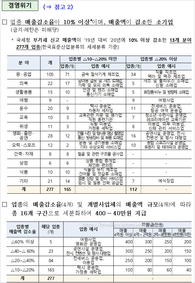 경영위기업종 지원 대상은 매출액 감소비율 4개 유형과 사업체 매출액 규모 4개 유형에 따라 400만원에서 40만원을 지원 받을 수 있습니다.