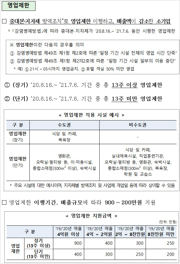 소상공인 영업제한 업종의 경우 지난해 8월16일부터 올해 7월6일까지 기간 중 영업제한 조치를 이행하고 매출이 감소한 사업체가 지원 대상이 됩니다.